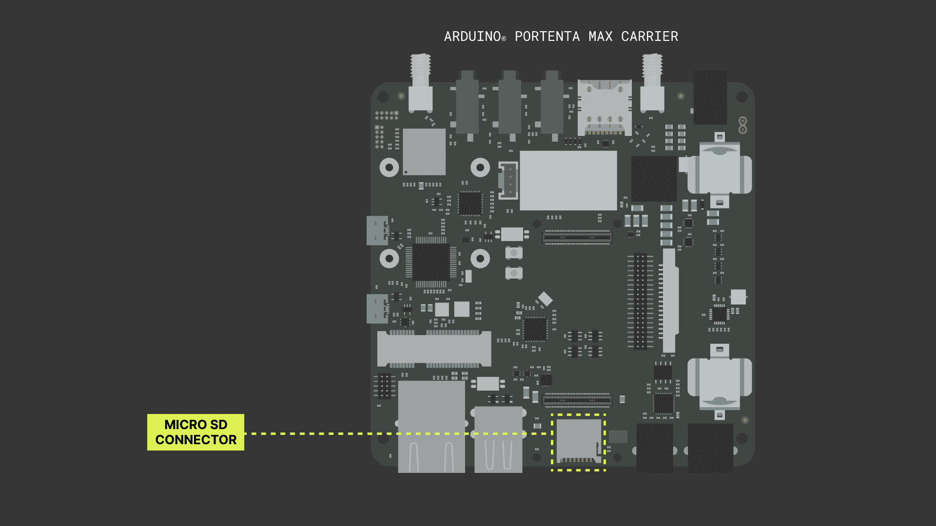 The Portenta Max Carrier equips two different memory units onboard: Flash Memory and Mini SD Card slot.