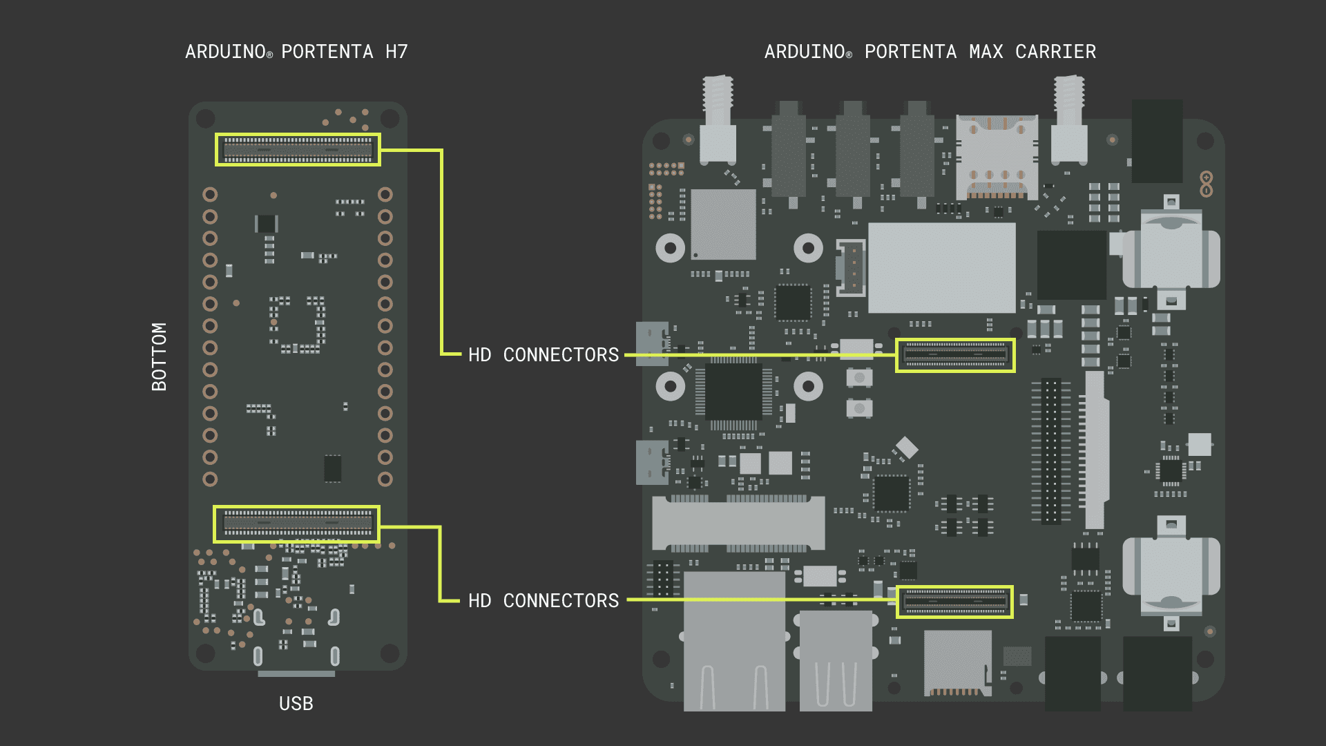 The Portenta Max Carrier establishes a connection with Portenta H7 via High-Density connectors. This interface grants access to extensive modules and peripherals on-board the Portenta Max Carrier.