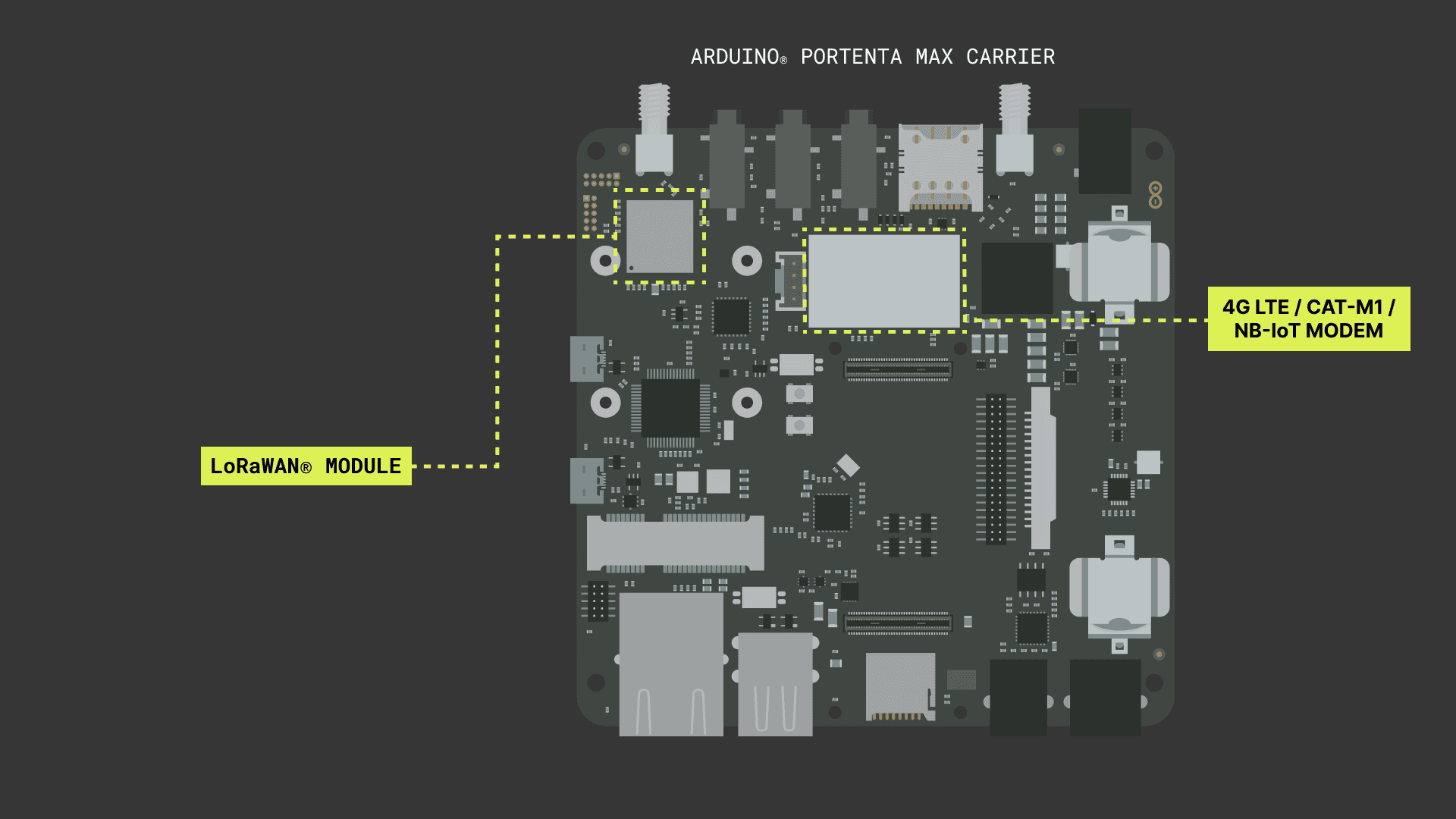The Portenta Max Carrier has on-board Murata CMWX1ZZABZ-078 LoRaWAN® Module and SARA-R412M-02B Cell Modem shown in the following image below: