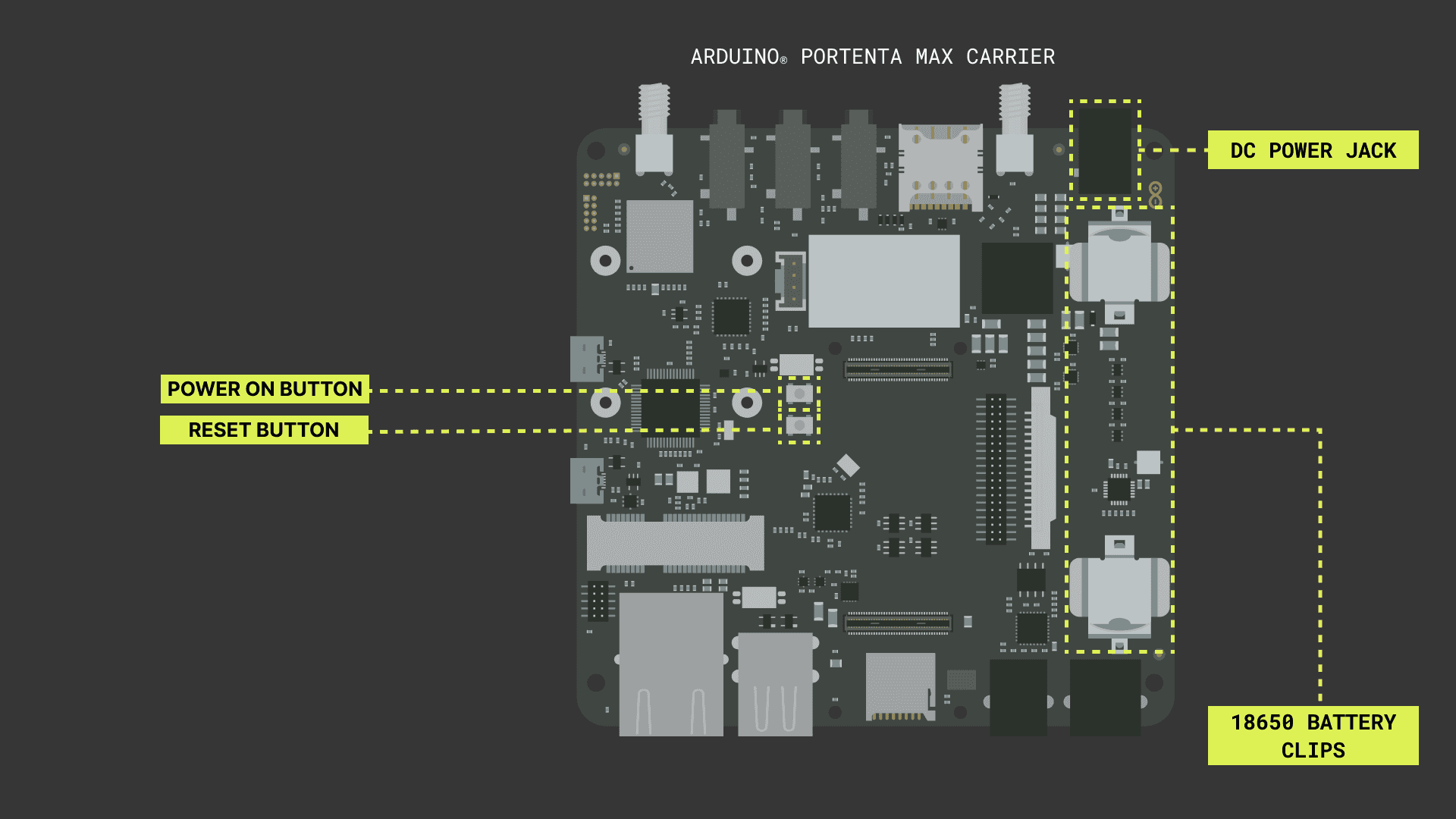 To power the Portenta Max Carrier, you can use the barrel jack connector (X1) or a 3.7V 18650 Li-Ion battery connected to the Portenta Max Carrier's battery clips (J16 and J18). You can also power the Portenta Max Carrier directly from the USB-C® connector of the Portenta H7 board.