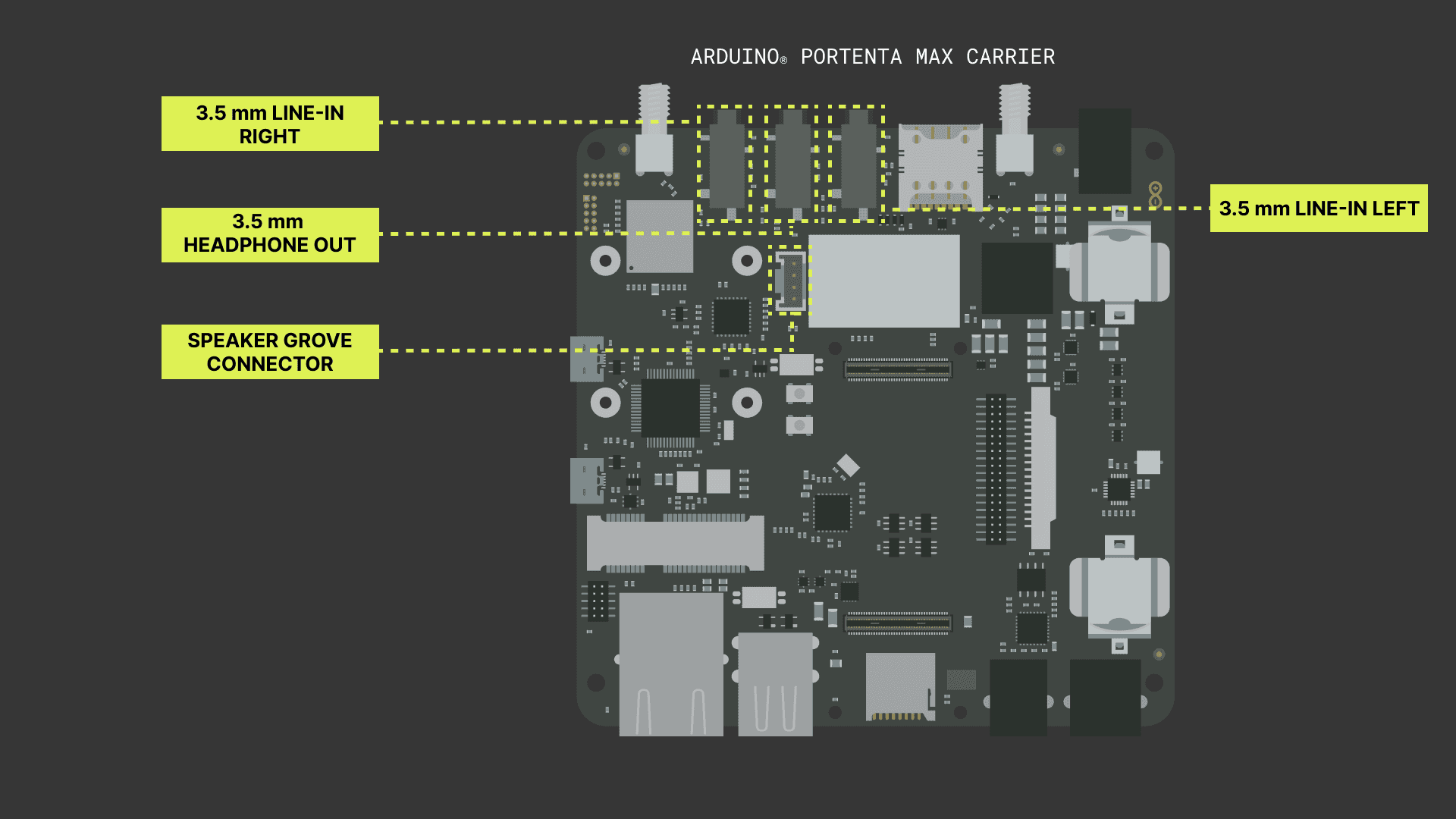 The Portenta Max Carrier features a stereo CODEC, the CS42L52 from Cirrus Logic®. The CS42L52 is a 24-bit, low-power stereo CODEC that can provide up to 1W per channel of Class D stereo/mono amplification to external speakers (8-ohm stereo speakers and 4-ohm mono speakers) or enough power to drive 44mW per channel into stereo headphones. There are four analog audio interfaces in the Portenta Max Carrier, as shown in the image below: